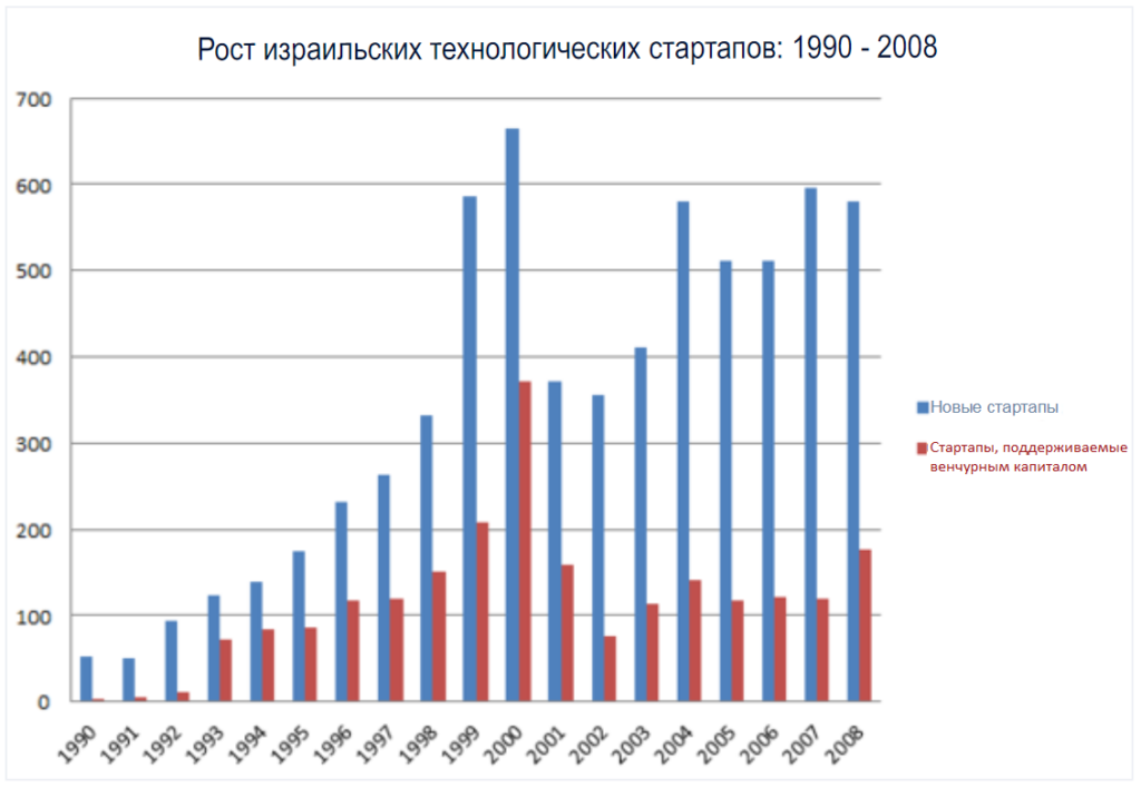 Ситуация начала меняться с появлением программы Yozma – государственного венчурного фонда с капиталом в 100 миллионов долларов, который начал свою работу в 1993 году. Часть денег была инвестирована непосредственно в стартапы. Но что еще более важно, программа убедила иностранных венчурных капиталистов создавать фонды в Израиле, снизив налоги и пообещав компенсировать часть денег, которые они привлекали от инвесторов. Таким образом, был запущен благотворный цикл, создавший процветающий, независимый рынок венчурного капитала, который к 2000 году поддерживал сотни стартапов в год, как показано на графике ниже, адаптированном из работы израильского исследователя Гиля Авнимелеха. После того как рынок заработал, правительство приватизировало Yozma в 1998 году.